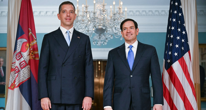 Secretary of State Marco Rubio and Serbian Foreign Minister Marko Djuric meet at the State Department in Washington, D.C., Aug. 6, 2025. (Jim Watson/AFP via Getty Images)